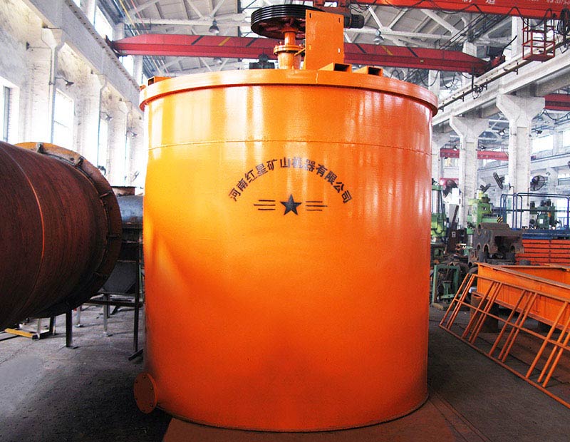 攪拌桶由電動機(jī)、葉輪、定子、軸承等部件組成,采用平底桶形輻射循環(huán)螺旋葉輪機(jī)械攪拌式方法進(jìn)行攪拌作業(yè)。攪拌槽工作時電動機(jī)牽引三角帶傳動裝置帶動葉輪旋轉(zhuǎn),礦漿和藥劑在葉輪的勻速攪拌作用下實現(xiàn)充分的相互混合,增加藥劑對礦漿的反應(yīng)時間,對藥物的反應(yīng)質(zhì)量進(jìn)行強(qiáng)化,從而使物料得到充分的攪拌和混合,為下一階段的浮選機(jī)生產(chǎn)做好必要的準(zhǔn)備條件。